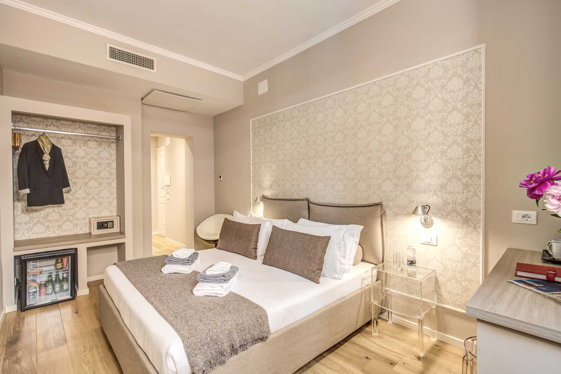 OUR STANDARD ROOMS HAVE A FRENCH BED IN AN ELEGANT AND REFINED ENVIRONMENT. THE ROOMS ARE EQUIPPED WITH A PRIVATE BATHROOM WITH A SHOWER, DESIGNED TO OFFER YOU ALL MODEST SERVICES AND TECHNOLOGIES, LIKE FREE WI-FI CONNECTION, SAFE FOR LAPTOP, FLAT SCREEN TV, AIR CONDITIONER, MINIBAR, TEA OR COFFEE TANKER AND LIVING ROOM . THE SIZE OF THE ROOM IS 14 M². THE CHECK-IN IS MADE FROM 2.00 PM AND THE CHECK-OUT UNTIL 11.00
